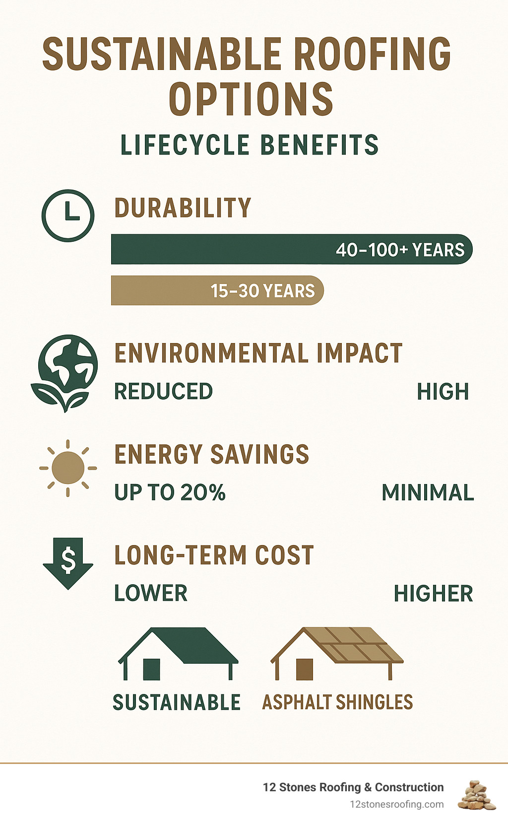 Metal Roofing | 50-75+ | High | Excellent | Highly recyclable (often >25% recycled content), long lifespan reduces waste, cool roof options save energy |
